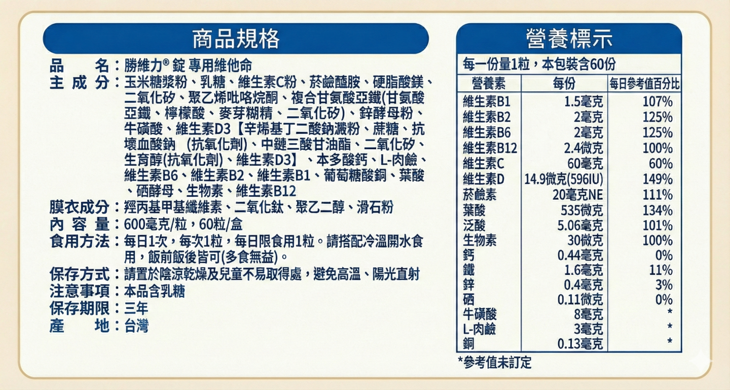這就是為什麼,你需要一款「量身打造」的補充品。 我們不是盲目地把所有維他命混在一起,而是根據國人的飲食習慣與特殊代謝需求,精算出最適合的「黃金比例」——補足你容易流失的,減去你不需要的。