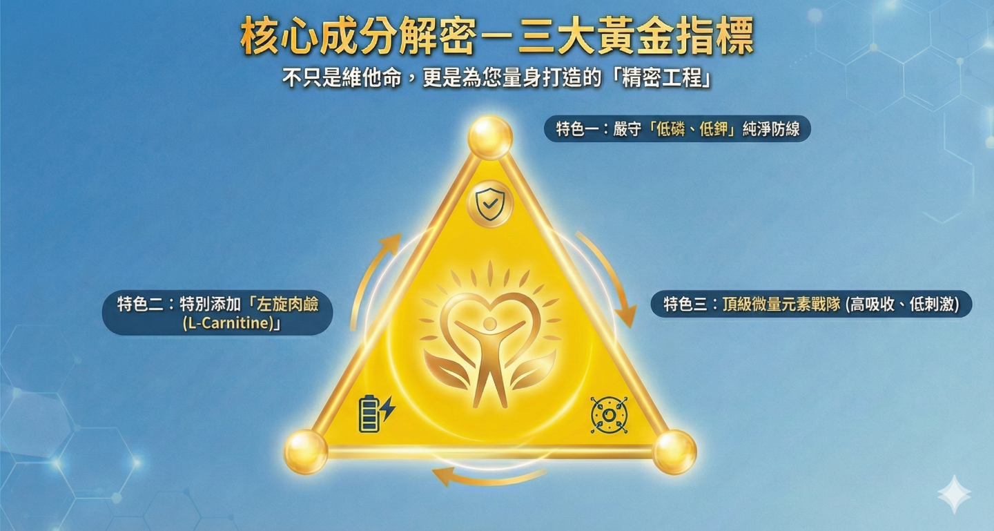 你需要的是一種「潔淨的營養」。剔除所有不需要的負擔(低磷、低鉀),只留下臨床證實最關鍵、最容易流失的營養素。
