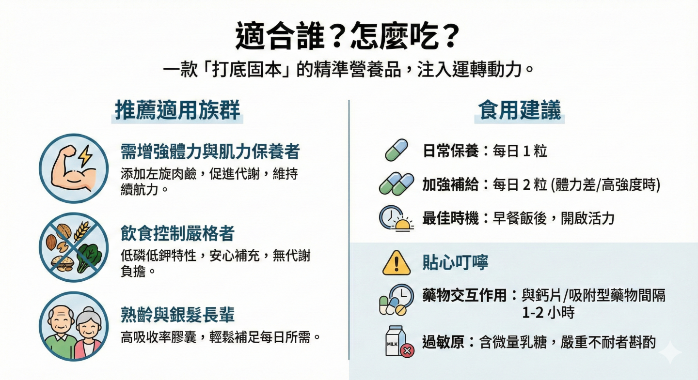 這是一款「打底固本」的精準營養品,不只補充缺口,更為身體注入運轉動力。- 需增強體力與肌力保養者:特別添加關鍵成分 「左旋肉鹼 (L-Carnitine)」,有助於促進新陳代謝,調節生理機能。對於感覺體力衰退、想要維持肌肉正常生理功能、或是日常活動量大需要能量補給的人,這是您維持續航力的最佳隊友。