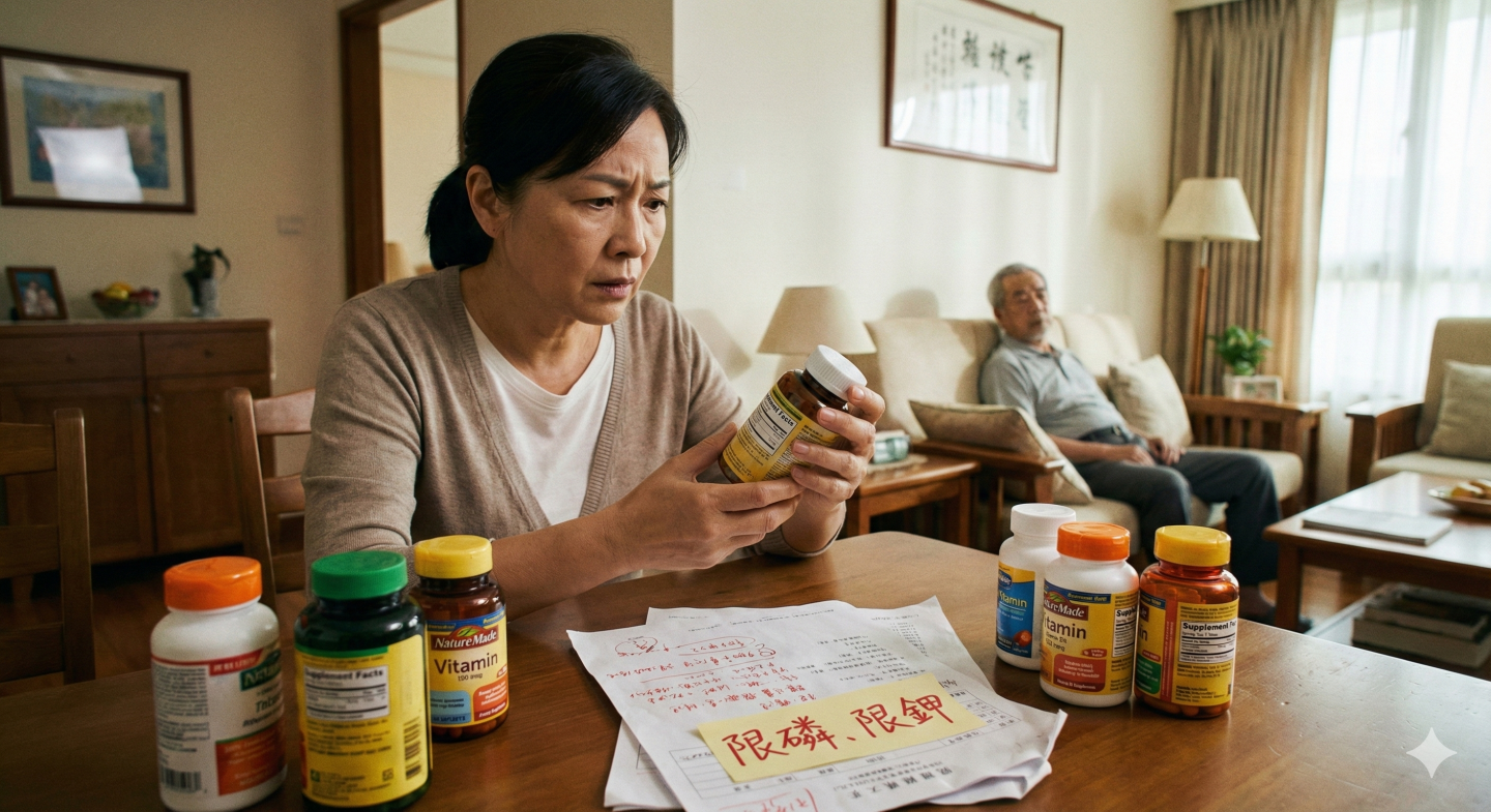 手裡拿起市面上標榜「高單位」、「全方位」、「增強體力」的綜合維他命,但下一秒,腦海中卻響起衛教室裡的叮嚀:「磷要低」、「鉀要限」、「不能亂吃成藥和不明保健品」。