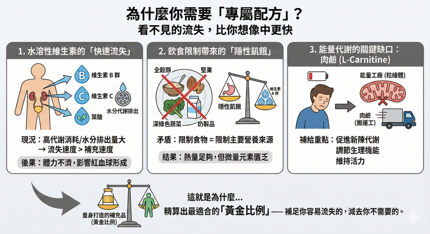 許多人以為,只要三餐正常吃就足夠了。但在「特殊生理代謝」或「嚴格飲食管理」的狀態下,身體營養的「進」與「出」往往已經失去了平衡。