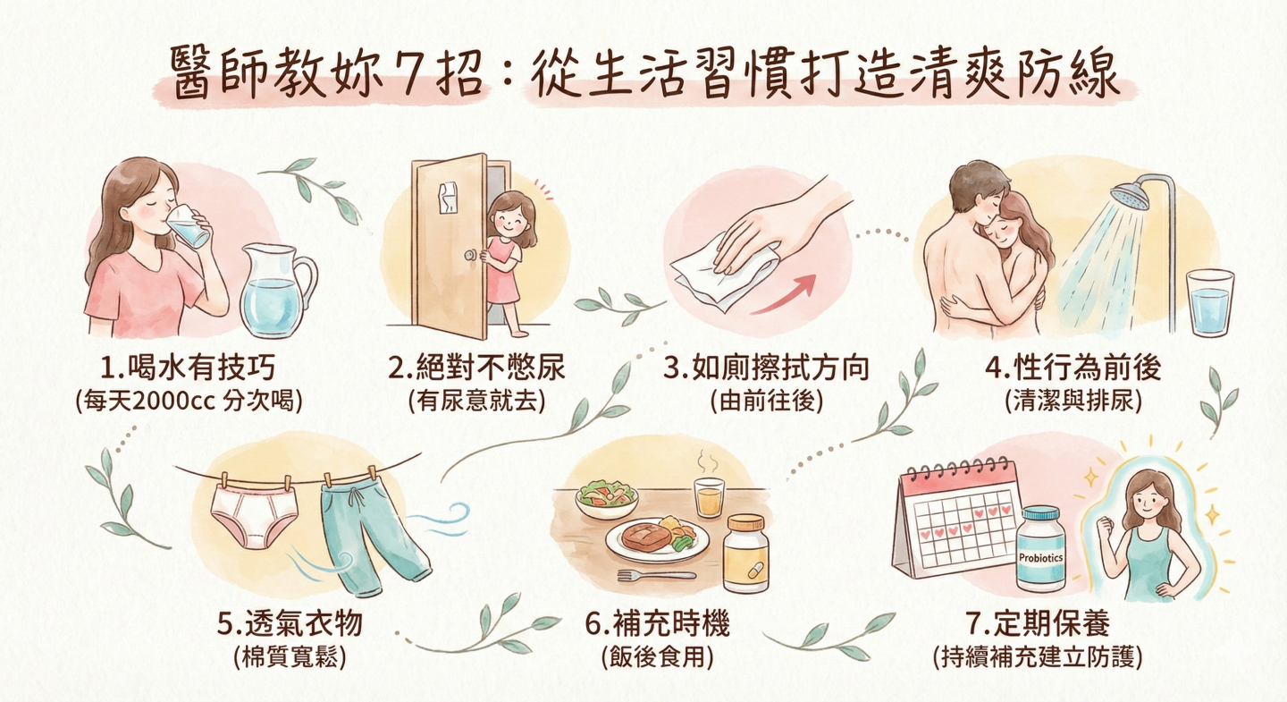 - 性行為前後: 事前清潔,事後務必「排尿」並喝水,沖出可能入侵的細菌。