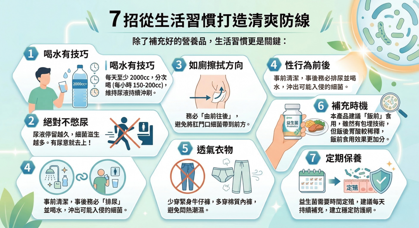 性行為前後:事前清潔,事後務必「排尿」並喝水,沖出可能入侵的細菌。