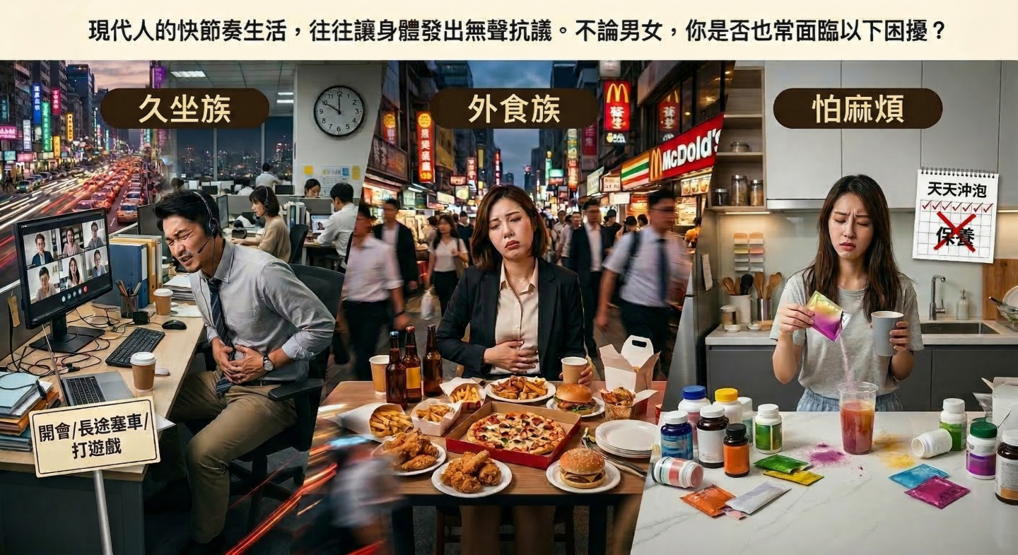 現代人的快節奏生活,往往讓身體發出無聲抗議。不論男女,你是否也常面臨以下困擾?