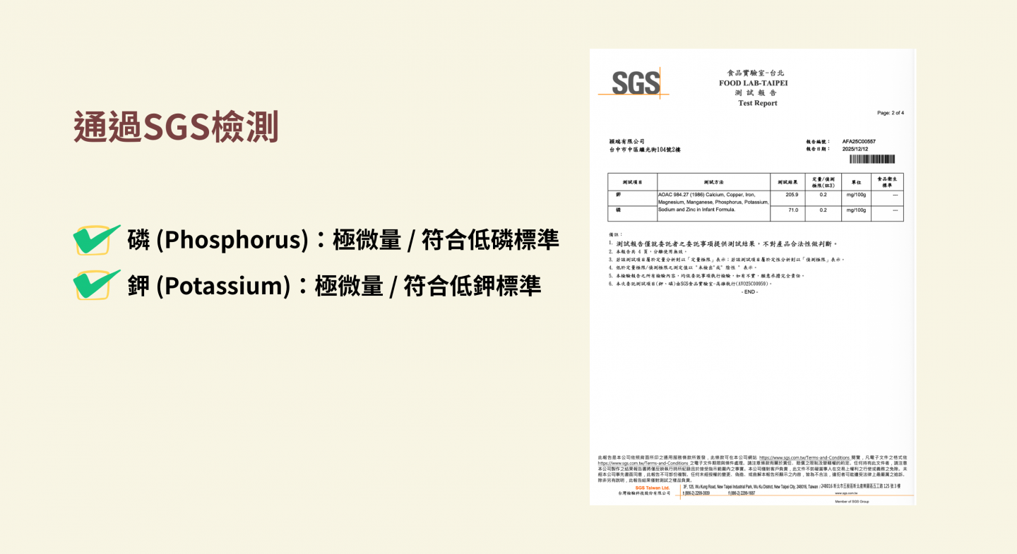 A:是的。這正是我們特別送驗「磷、鉀」的原因。本產品確認為低磷鉀配方,對需要嚴格控制飲食的族群是安全的。但因每個人當下抽血數值與藥物不同,建議您可帶著產品成分表諮詢您的主治醫師。