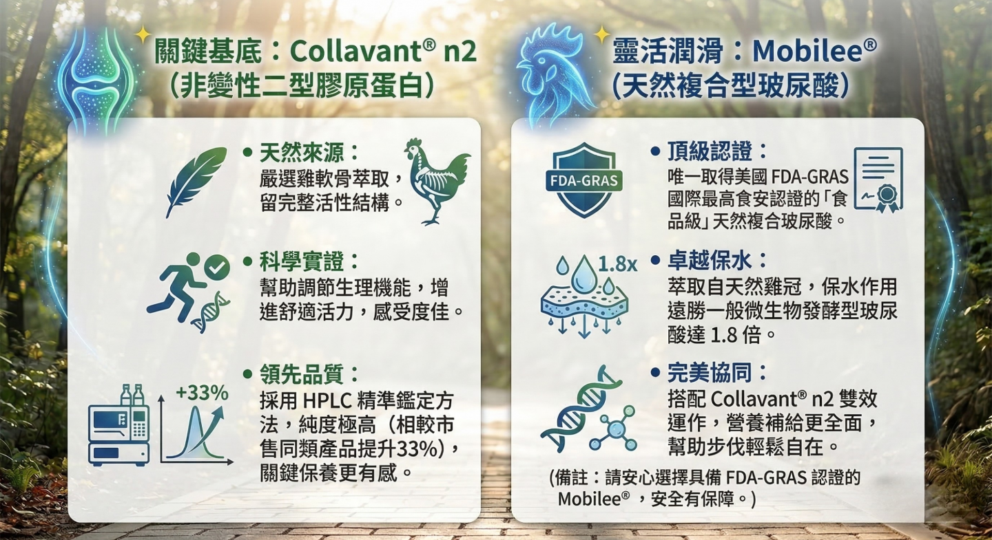 完美協同:搭配 Collavant® n2 雙效運作,營養補給更全面,幫助步伐輕鬆自在。