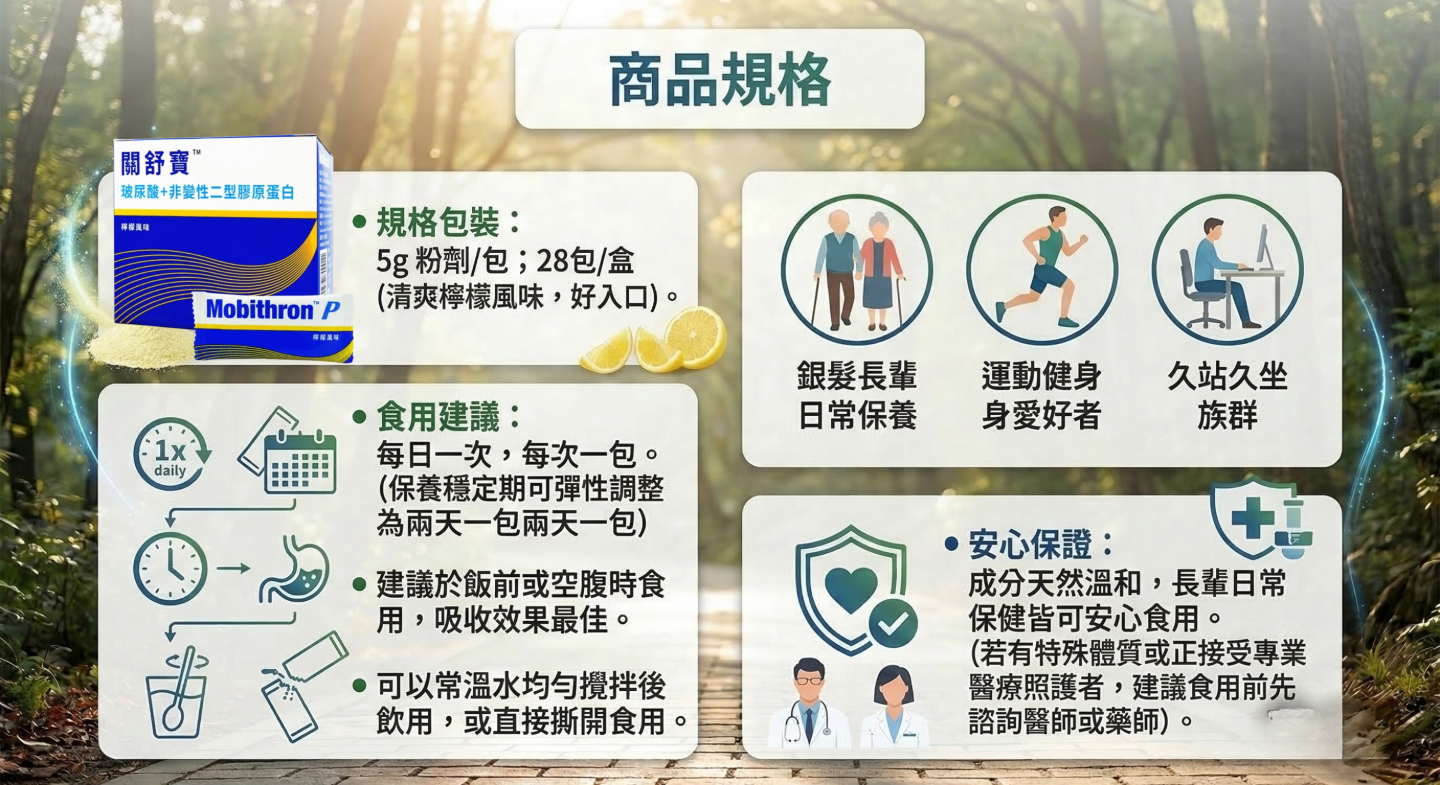 A3:保健食品的營養補給需要時間累積。建議您初期先穩定每日一包,持續約3~6個月。當您覺得關鍵環節的舒適度與靈活度已經穩定維持後,就可以將保養頻率調整為「每兩天一包」,作為長期的日常健康維持。